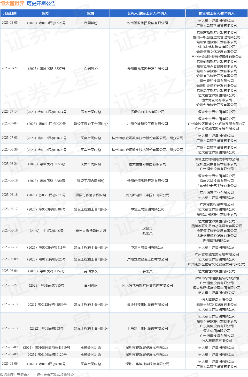 案号:(2025)琼9003民初3407号审理法院:儋州市人民法院案由:建设工程施工合同纠纷当事人信息: 原告/上诉人:中建三局集团有限公司 被告/被上诉人:广东贸琪投资有限公司、恒大童世界集团有限公司、儋州宜倍旅游开发有限公司开庭日期:2025年6月17日根据统计,近一年内以恒大童世界集团有限公司为当事人的历史开庭公告有325则,其中案由为“票据纠纷”的公告以81则居首,其次为“合同纠纷”有60则,“建设工程施工合同纠纷”有37则。历史开庭公告(前20条)如下: